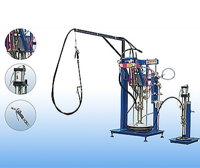 The Component B rubber pump is respectively provided with a set of pneumatic lifting mechanisms which are respectively composed of two parallel air cylinders and fixedly connected with respective pump bodies through crossbeams. The force between the two cylinders acts on the rubber surface through the pressure plate, the pressure is adjusted by the pressure regulating valve, generally about 0.3 MPA. Exit the Pail to replace the new pail.